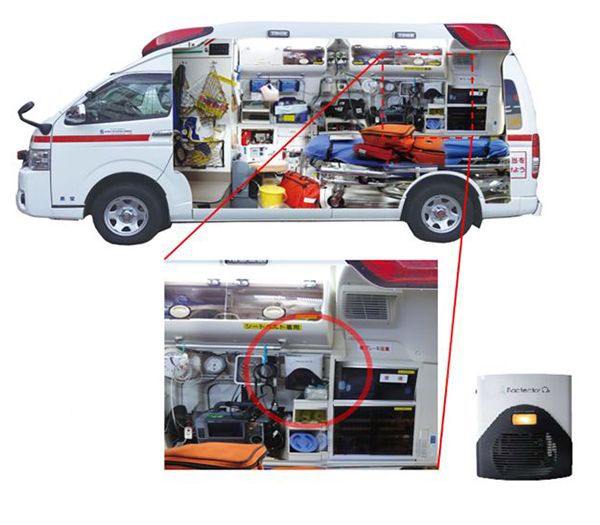 日々患者を搬送する救急隊員と救急車救急隊員の感染症防止の為に、「エアバスター」オゾンガス除菌システムの同型機救急用が導入されています。